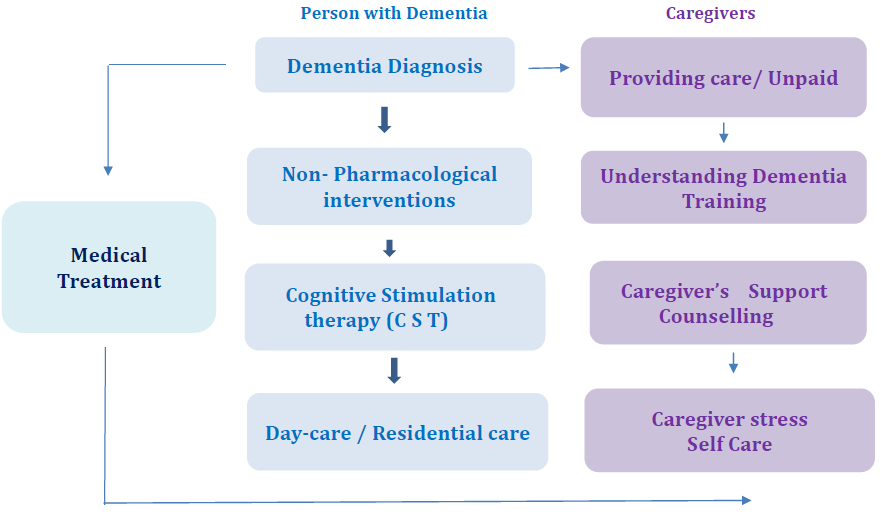 Dementia as of now has no CURE only CARE. Each individual living with dementia is unique with their own tra trajectory of illness. As the condition progresses patients develop personality changes, behavioural and psychological symptoms which may require management with medications. Research has shown that along wi with medications, cognitive stimulation and rehabilitation therapies are very beneficial in helping preserve the cognitive reserve, reduce the psychological symptoms and delay the progression of dementia.